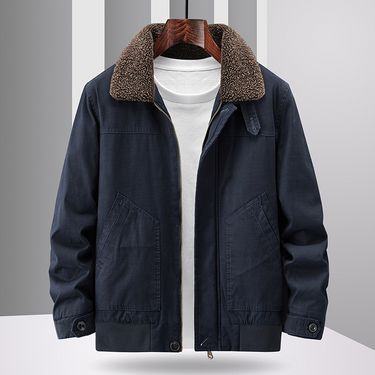 Designed for crisp autumn days, this structured bomber jacket combines heritage workwear with modern comfort. The durable canvas exterior shields against wind while plush sherpa trim adds warmth around the collar. Angular patch pockets and ribbed hem create a clean, architectural silhouette.