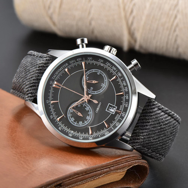 Track every moment with refined precision. This chronograph pairs a polished stainless-steel case with a textured canvas strap, delivering functionality that feels effortlessly sophisticated.
